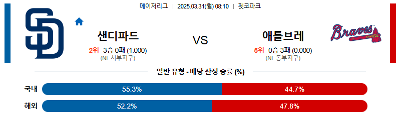 샌디에이고 대 애틀랜타 MLB 03월31일 맞대결 생중계, 스포츠중계, 스포츠분석