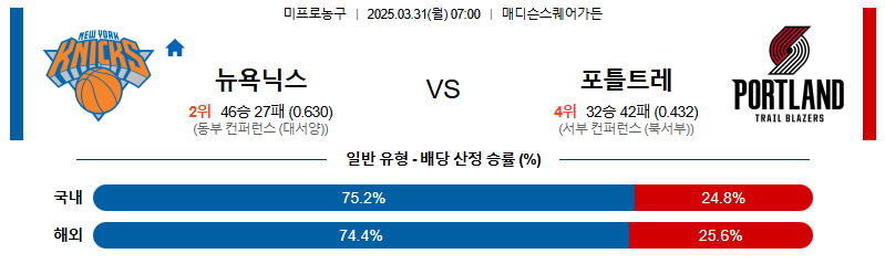 뉴욕닉스 대 포틀랜드 NBA 03월31일 맞대결 생중계, 스포츠중계, 스포츠분석