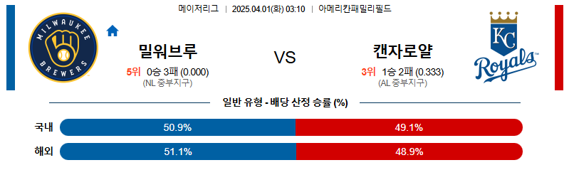 밀워키 대 캔자스시티 MLB 04월01일 맞대결 생중계, 스포츠중계, 스포츠분석