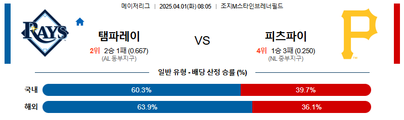 탬파베이 대 피츠버그 MLB 04월01일 맞대결 생중계, 스포츠중계, 스포츠분석
