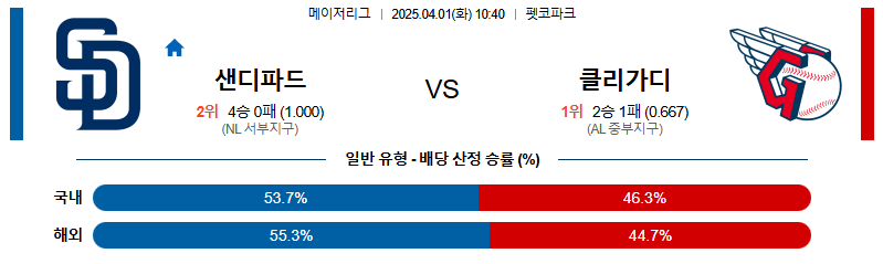 샌디에이고 대 클리블랜드 MLB 04월01일 맞대결 생중계, 스포츠중계, 스포츠분석
