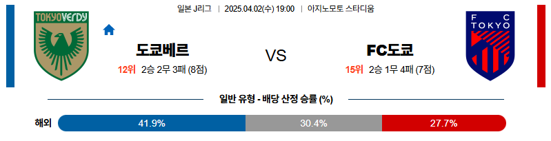 도쿄베르디 대 FC도쿄 J리그1 04월02일 맞대결 생중계, 스포츠중계, 스포츠분석