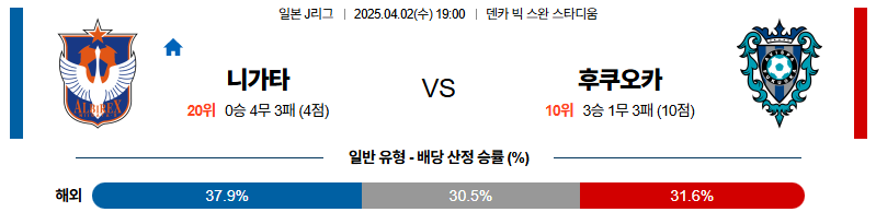 니가타는 이번 시즌 유일한 J1 무승 팀으로 아직 첫 승을 신고하지 못한 채 홈에서 후쿠오카를 상대하게 됩니다. 지난 경기에서는 베테랑 센터백 치바 가즈히코와 공격수 오노 유지의 활약 속에 세 골을 기록하며 희망적인 장면을 만들어냈지만, 리드를 지키지 못하고 추가 시간에 페널티킥 실점으로 승리를 놓쳤습니다. 경기력은 점차 나아지고 있지만 수비 집중력과 종료 직전 실점 문제가 발목을 잡고 있습니다. 특히 수비 불안과 마무리에서의 아쉬움은 여전히 해소되지 않은 과제로 남아 있으며, 현재 흐름만으로는 강한 수비를 바탕으로 한 상대를 상대로 승점을 쉽게 챙기기 어려워 보입니다.