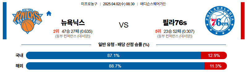 뉴욕닉스 대 필라델피아 NBA 04월02일 맞대결 생중계, 스포츠중계, 스포츠분석
