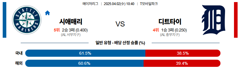 시애틀 대 디트로이트 MLB 04월02일 맞대결 생중계, 스포츠중계, 스포츠분석