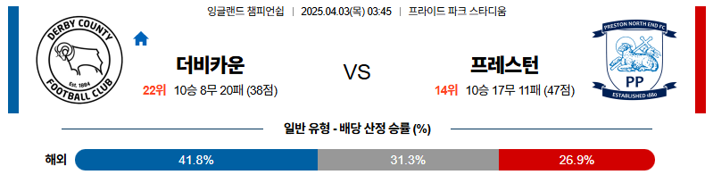 더비카운티 대 프레스턴 잉글랜드챔피언쉽 04월03일 맞대결 생중계, 스포츠중계, 스포츠분석