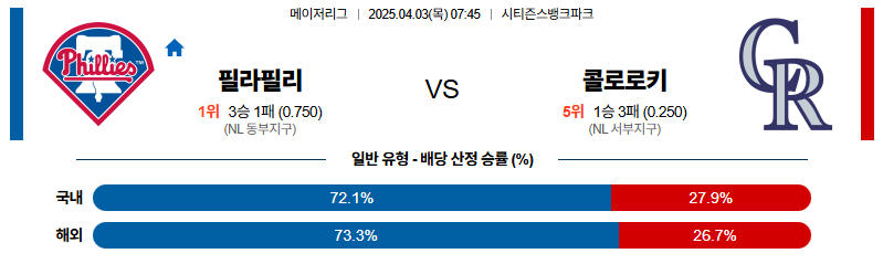 필라델피아 대 콜로라도 MLB 04월03일 맞대결 생중계, 스포츠중계, 스포츠분석