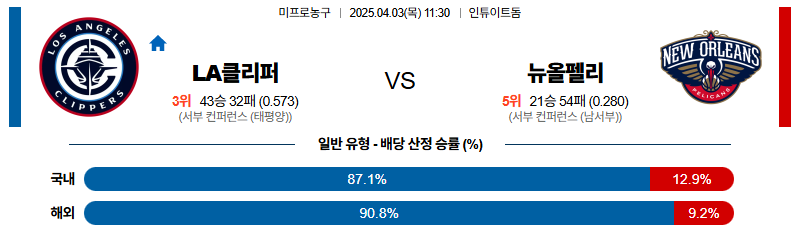 LA클리퍼스 대 뉴올리언스 NBA 04월03일 맞대결 생중계, 스포츠중계, 스포츠분석