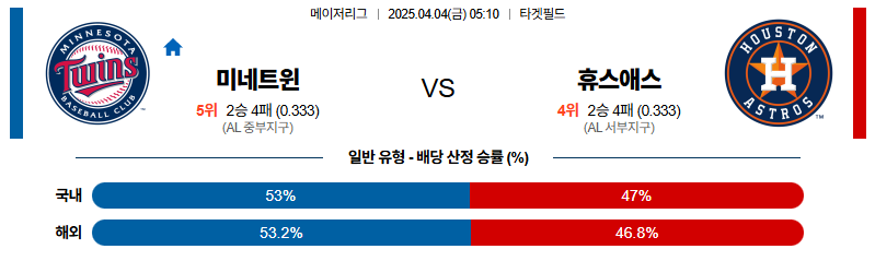 미네소타 대 휴스턴 MLB 04월04일 맞대결 생중계, 스포츠중계, 스포츠분석