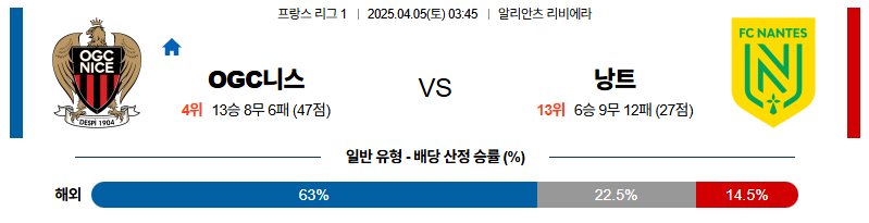 니스 대 낭트 리그앙 04월05일 맞대결 생중계, 스포츠중계, 스포츠분석