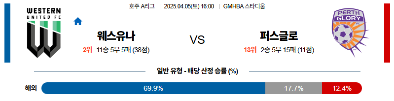 웨스턴유나이티드 대 퍼스글로리 호주A리그 04월05일 맞대결 생중계, 스포츠중계, 스포츠분석