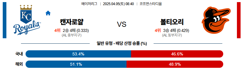 캔자스시티 대 볼티모어 MLB 04월05일 맞대결 생중계, 스포츠중계, 스포츠분석