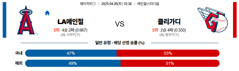 LA에인절스 대 클리블랜드 MLB 04월05일 맞대결 생중계, 스포츠중계, 스포츠분석