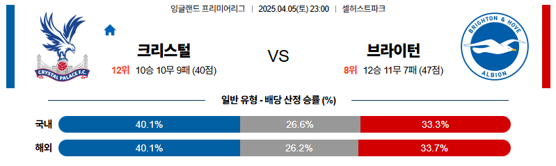 크리스탈팰리스 대 브라이튼 프리미어리그 04월05일 맞대결 생중계, 스포츠중계, 스포츠분석