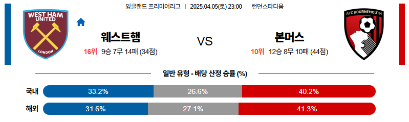 웨스트햄 대 본머스 프리미어리그 04월05일 맞대결 생중계, 스포츠중계, 스포츠분석