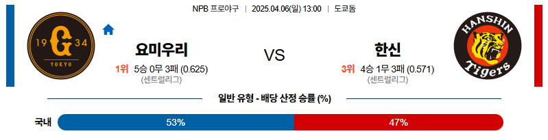 요미우리 대 한신 NPB 04월06일 맞대결 생중계, 스포츠중계, 스포츠분석