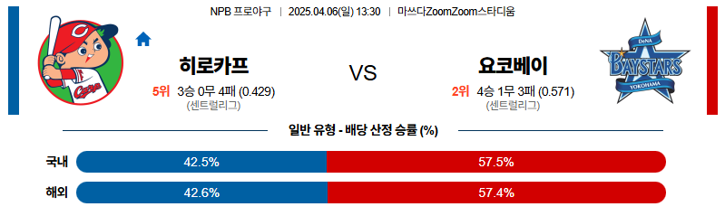 히로시마 대 요코하마 NPB 04월06일 맞대결 생중계, 스포츠중계, 스포츠분석