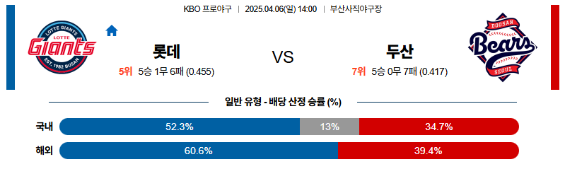 롯데 대 두산 KBO 04월06일 맞대결 생중계, 스포츠중계, 스포츠분석