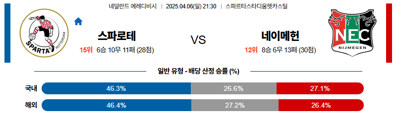 스파르타 대 네이메헌 에레디비지에 04월06일 맞대결 생중계, 스포츠중계, 스포츠분석