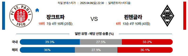 상파울리 대 글라트바흐 분데스리가 04월06일 맞대결 생중계, 스포츠중계, 스포츠분석