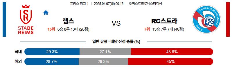 안정된 흐름과 전방 결정력을 보유한 스트라스부르가 원정에서도 우위를 점할 가능성이 높습니다.