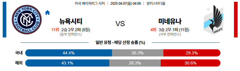 뉴욕시티 대 미네소타 메이저리그사커 04월07일 맞대결 생중계, 스포츠중계, 스포츠분석