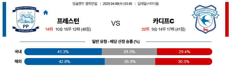 프레스턴 대 카디프시티 잉글랜드챔피언쉽 04월09일 맞대결 생중계, 스포츠중계, 스포츠분석