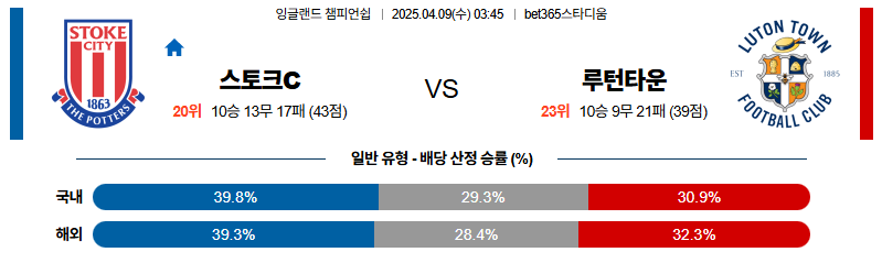 스토크시티 대 루턴타운 잉글랜드챔피언쉽 04월09일 맞대결 생중계, 스포츠중계, 스포츠분석