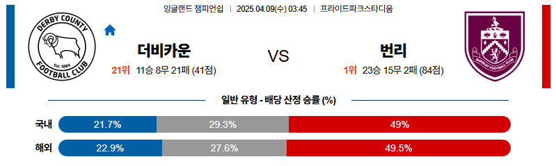 더비카운티 대 번리 잉글랜드챔피언쉽 04월09일 맞대결 생중계, 스포츠중계, 스포츠분석
