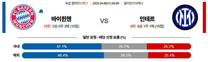 바이에른 뮌헨은 포백 시스템을 바탕으로 하프스페이스를 침투하는 전술이 매우 효과적입니다. 인터밀란은 윙백의 수비 가담이 늦어질 경우 이 공간을 막기 어려워, 뮌헨의 공격에 수세로 몰릴 가능성이 큽니다. 그러므로 바이에른 뮌헨 승을 추천드립니다.