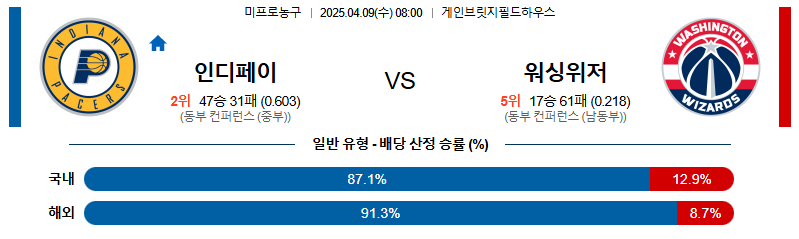 인디애나 대 워싱턴 NBA 04월09일 맞대결 생중계, 스포츠중계, 스포츠분석