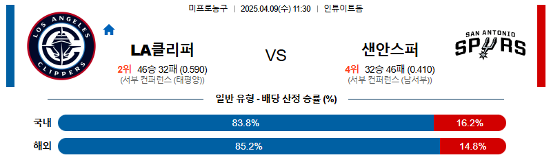 LA클리퍼스 대 샌안토니오 NBA 04월09일 맞대결 생중계, 스포츠중계, 스포츠분석