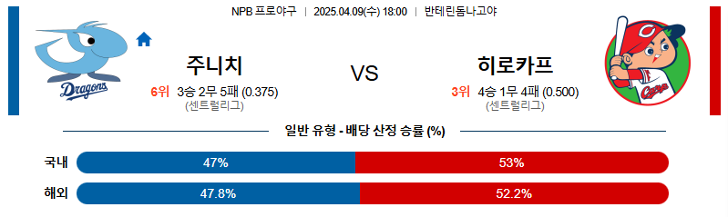 주니치 대 히로시마 NPB 04월09일 맞대결 생중계, 스포츠중계, 스포츠분석