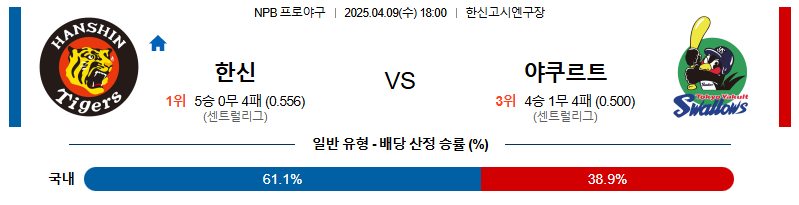 한신 대 야쿠르트 NPB 04월09일 맞대결 생중계, 스포츠중계, 스포츠분석