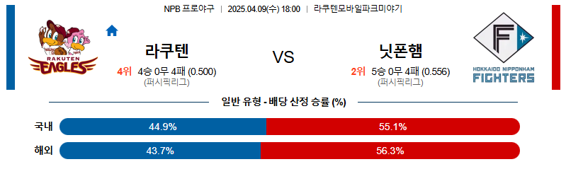 라쿠텐 대 니혼햄 NPB 04월09일 맞대결 생중계, 스포츠중계, 스포츠분석
