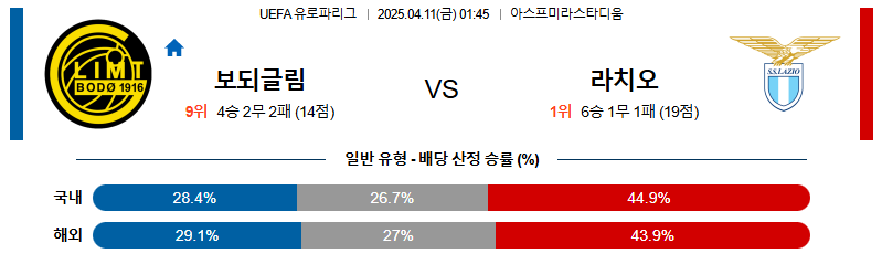 보되글림트 대 라치오 UEFA유로파리그 04월11일 맞대결 생중계, 스포츠중계, 스포츠분석