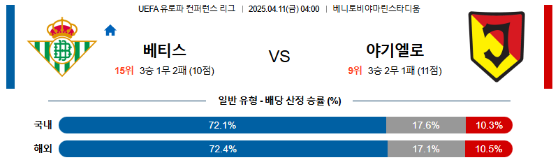 베티스 대 야기엘로니아 UEFA컨퍼런스리그 04월11일 맞대결 생중계, 스포츠중계, 스포츠분석