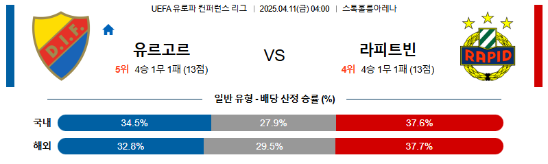 유르고르덴 대 라피드빈 UEFA컨퍼런스리그 04월11일 맞대결 생중계, 스포츠중계, 스포츠분석