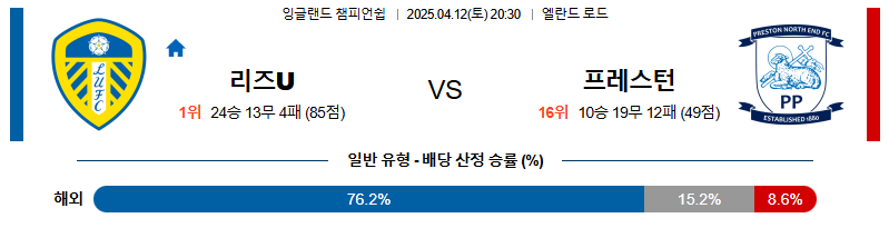 리즈 대 프레스턴 잉글랜드챔피언쉽 04월12일 맞대결 생중계, 스포츠중계, 스포츠분석
