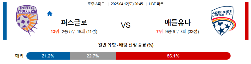 애들레이드는 연패 중임에도 공격력은 건재하며, 퍼스 글로리의 수비 구조 붕괴와 중원 통제력 부족을 효과적으로 공략할 수 있는 전술 구조를 보유하고 있습니다. 반면 퍼스는 수비 조직이 와해된 상황에서 애들레이드의 좌우 폭 넓은 전개를 막아내기 어렵습니다. 전반적 경기 흐름상 다득점 경기로 이어질 공산이 크며, 애들레이드가 안정적인 승리를 가져갈 수 있을 것입니다.