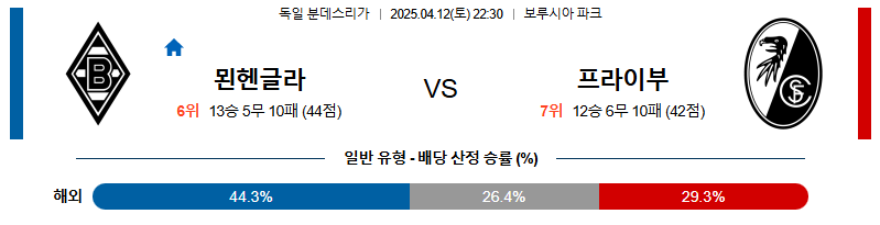 묀헨글라트바흐 대 프라이부르크 분데스리가 04월12일 맞대결 생중계, 스포츠중계, 스포츠분석