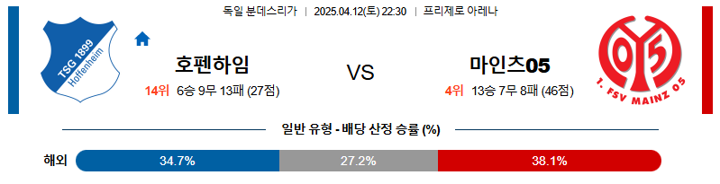호펜하임 대 마인츠 분데스리가 04월12일 맞대결 생중계, 스포츠중계, 스포츠분석