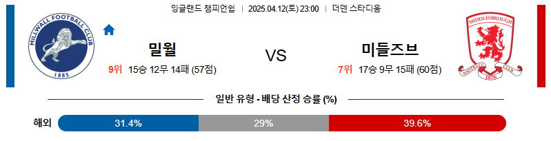 밀월 대 미들즈브러 잉글랜드챔피언쉽 04월12일 맞대결 생중계, 스포츠중계, 스포츠분석