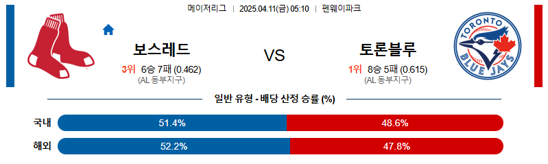 보스턴 대 토론토 MLB 04월11일 맞대결 생중계, 스포츠중계, 스포츠분석
