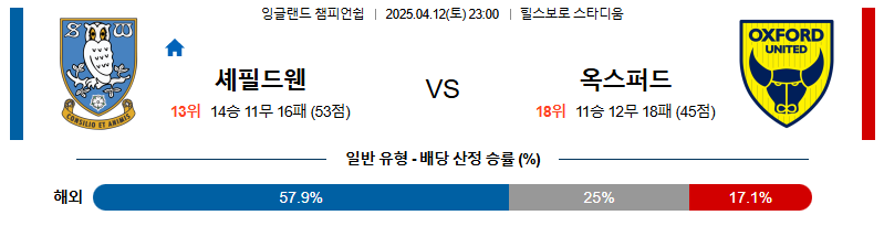 셰필드웬즈데이 대 옥스퍼드유나이티드 잉글랜드챔피언쉽 04월12일 맞대결 생중계, 스포츠중계, 스포츠분석