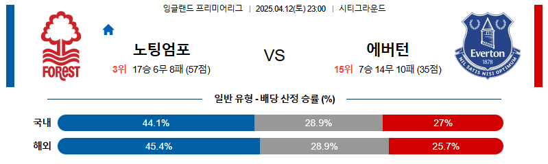 노팅엄은 수비적인 안정성과 홈 경기력에서 우위를 보이지만, 공격 핵심들의 부재로 인해 확실한 마무리에 어려움을 겪을 수 있습니다. 에버턴은 수비 중심의 전술로 실점 억제에 강점을 가지며, 득점보다는 실점 방지에 초점을 둔 경기 운영을 할 것으로 예상됩니다. 양 팀 모두 실리를 중시하는 스타일이기 때문에 득점 기회가 많지 않을 가능성이 큽니다. 지루한 흐름 속에서 무승부 가능성이 높습니다.