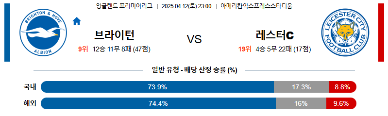 브라이튼 대 레스터 프리미어리그 04월12일 맞대결 생중계, 스포츠중계, 스포츠분석