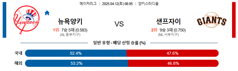 뉴욕양키스 대 샌프란시스코 MLB 04월12일 맞대결 생중계, 스포츠중계, 스포츠분석