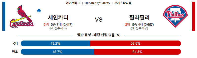 세인트루이스 대 필라델피아 MLB 04월12일 맞대결 생중계, 스포츠중계, 스포츠분석