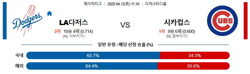LA다저스 대 시카고컵스 MLB 04월12일 맞대결 생중계, 스포츠중계, 스포츠분석